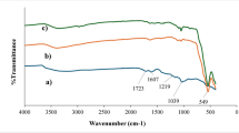 The FTIR spectra of bare Fe3O4, commercial L-Cyst, L-Cyst-Fe3O4 NPs, Pb2+ and Cr6+ loaded L-Cyst-Fe3O4 NPs were obtained in the range of 400–4000 cm−1 [Fig. 7A(a–e)]. The sharp band of magnetite appeared at 568 cm−1 and became less intense at 602 cm−1 57. A strong band at 568 cm−1 is a characteristic of Fe-O absorption due to its symmetric stretching vibration27. Sharp peaks at 1640 and 3437 cm−1 were attributed to O-H stretching and bending vibrational bands of water moiety adsorbed on magnetite surface [curve (a)]. A strong peak at 2351 cm−1 attributes to carbon dioxide (ѵ CO2)55, 57, 58. A curve (b) shows FT-IR spectrum of commercial L-Cyst. This curve exhibits its characteristic bands at 1602 and 1390 cm−1 due to the asymmetric and symmetric stretching of COO− 27. The band at 1586 cm−1 corresponds to N–H bending. A sharp peak of NH3 + stretch is observed between 2982–3182 and 3747 cm−1. A weak band at 2550–2362 cm−1 is due to the presence of S–H group59. However, after the functionalization of L-Cyst onto the surface of magnetite NPs, some new peaks emerged at 1624, 1590 and 1406 cm−1 corresponding to asymmetric and symmetric stretching of COO− and -NH2. Amide band indicates the successful functionalization of L-Cyst molecules onto magnetite surface. In addition, the sharp peak at 2069 cm−1 disappeared [curve (c)], implying the formation of the covalent bond between Fe and S. Similar observations were reported earlier for L-Cyst capped Fe3O4 NPs21, 27.