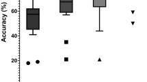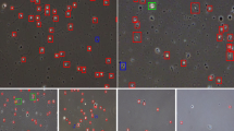 Our data is given by the seven morphological features of the acrosomes and the acrosome subpopulation to which each cell belongs (Spermatids/Spermatozoa). That is, each cell is represented by a pair (\({\overrightarrow{x}}_{i},{y}_{i}\)) with \({\overrightarrow{x}}_{i}\in {{\mathbb{R}}}^{7}\) a vector containing its morphological information, and y i ∈ {−1, 1} a subpopulation class label, where −1 encodes for “Spermatid” and 1 for “Spermatozoa”. We use the python implementation of Support Vector Machines provided by the machine-learning library scikit-learn (https://scikit-learn.org/stable). In particular, we use the function “sklearn.svm.SVC()”. Given the difference in sample size of the two groups (158 spermatids and 51 spermatozoa, see the Materials and Methods), it is important to set the keyword “class_weights” to “balanced”, which effectively sets statistical weights in the computation of the error term inversely proportional to the class observed frequencies. We use 10-fold cross validation, which means that, for each run of the algorithm, the data is randomly split into ten groups: nine are used to train the SVM, i.e. to determine the parameters \(\overrightarrow{w},b\) of the hyperplane, and one is used for prediction. This is repeated ten times, one for each group, so that in the end each datapoint has received one predicted label. Given the stochasticity in splitting the data, we average results over N r = 1000 runs of the algorithm. Increasing N r does not improve the results.