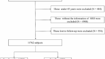 Blood samples were obtained after overnight fasting. Clinical parameters were categorized as follows: fasting plasma glucose (FPG) (Normal: FPG < 6.1, borderline high: 6.1 ≤ FPG < 7.0, high: FPG ≥ 7.0 mmol/L), total cholesterol (TC) (Normal: TC < 5.2, borderline high: 5.2 ≤ TC < 6.2, high: TC ≥ 6.2 mmol/L), triglycerides (TG) (Normal: TG < 1.7, borderline high: 1.7 ≤ TG < 2.3, high: TG ≥ 2.3 mmol/L), high-density lipoprotein (HDL) (Normal: LDL < 3.4, borderline high: 3.4 ≤ LDL < 4.1, high: LDL ≥ 4.1 mmol/L) and low-density lipoprotein (LDL) (Normal: HDL ≥ 1.0, low: HDL < 1.0 mmol/L)21, 22. TC, TG, LDL and HDL were measured enzymatically on an automatic analyzer (Hitachi 7600–020, China) with reagents purchased from Sichuan Xin Cheng Bio-Tech Co., Ltd. FPG was measured on the fasting blood glucose meter (Yicheng 5D-2, China). All clinical measurements were performed by the clinical laboratory staff of Hua County Hospital, Anyang, China.