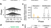 We measured statistical learning as (a) difference in reaction times (RTs) given to anticipated (probable) stimuli in contrast to unexpected (less probable) stimuli, termed as Statistical Learning Effect (SLE), and (b) by determining whether erroneous responses reflect anticipations of the most probable stimuli in cases when less probable trials came up (more details in Supplementary Methods 1.4–1.5). Statistical learning measured by the SLE score was evident in both the Learning and Rewiring Phase (see 95% confidence intervals, CIs, on Fig. 2a). In the Learning Phase, there could not possibly be any interference effects as only Sequence A had been introduced yet, we nevertheless contrasted the magnitude of learning of those transitional probabilities that were common during both Phases (unchanged sequence parts) and those that were about to change in the Rewiring Phase (changed sequence parts). As expected, there was no difference between the two (p = 0.568, Cohen’s d = 0.080), indicating that they were equally easy to learn (Fig. 2a, light vs. dark grey bars). In the Rewiring Phase, however, we found smaller statistical learning for the changed sequence parts (p < 0.001, d = 0.829) compared to the unchanged sequence parts (Fig. 2a, light grey vs. blue bars). This was apparent in the Implicit-Implicit (p < 0.001, d = 1.425) and Explicit-Explicit groups (p = 0.008, d = 0.737), but not in the Implicit-Explicit group (p = 0.128, d = 0.406). These results suggest that the Implicit-Explicit group was the most successful in adapting to the new statistical regularities, even to the extent that their rewired knowledge was not much different than that of the unchanged sequence parts. Interference effects were most clearly shown by contrasting the magnitude of learning of the same transitional types (changed vs. unchanged) over the two Phases. As expected, learning of the unchanged sequence parts did not decline in the Rewiring Phase (p = 0.151, d = 0.021, Fig. 2a, light grey bars in the Learning vs. Rewiring Phase), while learning of the changed sequence parts was significantly lower in Rewiring Phase than the original learning in the Learning Phase (p < 0.001, d = 0.729, Fig. 2a dark grey vs. blue bars). This pattern was apparent in the Implicit-Implicit (p < 0.001, d = 1.562) and Explicit-Explicit (p = 0.028, d = 0.850) groups, but not in the Implicit-Explicit group (p = 0.561, d = 0.155) – indicating, again, that the Implicit-Explicit group was the most successful in adapting to the changes in the sequence structure. The least successful group was the Implicit-Implicit group, evidenced by their statistical knowledge of the changed sequence parts in the Rewiring Phase (Fig. 2a, blue bars) being significantly smaller than both the Explicit-Explicit (p = 0.028, d = 0.743) and Implicit-Explicit groups’ (p < 0.001, d = 1.198). Additional analysis of the time course of rewiring revealed that the Implicit-Implicit group showed significant learning of the changed transitional probabilities only in the second half of the Rewiring Phase, suggesting slower updating of the previously acquired statistical knowledge (i.e., larger proactive interference) compared to the other two groups (for more details see Supplementary Results 2.1.1).