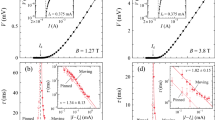 Figure 1(c) shows the I-V curve for a vortex state prepared by zero field cooling (ZFC) the sample A1 at 2.5 K and 0.7 T. From Fig. 1(b) note that the static vortex matter at 0.7 T and 2.5 K is well inside the shaded region above B on (T). Figure 1(c) shows that in the first (Forward) I-V run (blue circles), after depinning from the static vortex state at \({I}_{c}^{l}\) (2.5 K, 0.7 T) ~ 17.5 mA, the driven vortex state enters a linear flux flow (FF) I-V regime at I > 30 mA. In this linear regime we observe a sharp drop in V below the noise floor near 40 mA (marked as an NDR transition (to be discussed later)). Here the vortex state is in an immobile state. In Fig. 1(c) we see that a finite measurable voltage appears only at I ≥ \({I}_{c}^{h}\) ~ 45 mA and depinning commences with a highly fluctuating V-response, which is unlike the nature of depinning seen at \({I}_{c}^{l}\). In high drive regime between 80–90 mA range, the fluctuations in the V abruptly decrease and the I-V becomes linear. Without modifying B and T, we measure V while decreasing I from 100 mA to zero (viz., the 2nd reverse I-V run, pink squares in Fig. 1(c)). From this I-V we see the vortex state repins at I = \({I}_{c}^{h}\) and not \({I}_{c}^{l}\). This is unlike conventional behaviour where a low I c state is usually achieved while returning from large drives10. For the 3rd forward run (Fig. 1(c), brown triangles), viz., measure V while increasing I from 0 to 100 mA (B and T unaltered), we observe the driven vortex state depins only above \({I}_{c}^{h}\) with a fluctuating V-response similar to the 1st I-V run. Thus the low \({I}_{c}^{l}\) value is accessed only in the first I-V run. Beyond the abrupt drop in V, always the high \({I}_{c}^{h}\) state is accessed in the I-V. We show a similar transformation to the high critical current state using V(t) measurement at a constant drive in Fig. 1(f) for sample A1. Figure 1(f) shows that after 90 s of switching on 22 mA (\( > {I}_{c}^{l}(2.5\,{\rm{K}},0.7\,{\rm{T}}) \sim 17.5\) mA), the mean voltage drops from an almost steady value of 10 µV to below the noise floor i.e., the moving vortex state stops after 90 s. A critical current measurement (I-V) of this immobile state (reached via V(t)) reveals it has a high I c , viz., \({I}_{c}^{h}\).