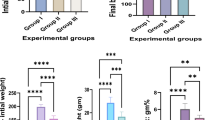 Powder of the rhizome of C. longa was provided by Laco SARL (Marseille, France). For the extraction, C. longa powder was macerated with hot water (80 °C) for 4 h, and the aqueous extract was evaporated under vacuum at 60 °C. The rhizome residue was re-extracted with ethanol at 60 °C during 2 h, filtered, and evaporated under vacuum. The final extract was a 1:1 mixture of the aqueous and alcohol extracts that was re-dissolved with 2% alcohol and then with 0.9% NaCl for the per os administration. The concentration of curcuminoids in the curcuma extract was determined by a UV-VIS spectrophotometer (Shimadzu). A 25 mg amount of sample extract was dissolved in 50 ml of ethanol by sonication. The sample was further filtered through 0.45 µm and diluted 1:25 in ethanol. The absorbance was measured at 426 nm and the curcuminoids were identified with curcumin pure standard with a molar absorbance of 1607 in ethanol. Total concentration of curcuminoids in the Curcuma extract was 1%. Curcuminoids composition of the extract was carried out by high-performance liquid chromatography (HPLC) with a Thermo Finnigan Spectra System UV6000LP (Thermo Fisher Scientific, Waltham, MA, USA) and a Pursuit XRS C18 column (250 × 4.6 mm and 5 µm, Agilent) with UV detection set at 426 nm. The sample (10 µl) was injected using the full-loop method. The separation of curcuminoids substances was achieved within 30 min using a mobile phase composed of HPLC-grade water containing 2% acetic acid (A) and acetonitrile (B) at 0.9 mL/min flow. The gradient elution was: 60% B (0–10 min), 90% B (10–30 min), the system returned to its initial condition (40% A/60% B) within 1 min, and was then equilibrated for 9 min. HPLC analysis revealed curcumin (58.8%), demethoxycurcumin (22.2%) and bisdemethoxycurcumin (19.0%). A HPLC chromatogram of this extract is shown in Supplementary Fig. S4. The antioxidant activity of the ethanol extract of Curcuma Longa has been attributed mainly to curcuminoid components present, as reported63. A profile of polar (methanol) and non-polar (hexane) extracts of Curcuma extract was performed by 1H NMR spectroscopy and Gas Chromatography/Electron Ionization Quadrupole Time of Flight Mass Spectrometry (GC/QTOF MS), respectively. 1H NMR spectroscopy identified mainly amino acids, organic acids and sugars. GC/QTOF MS analysis resulted in the detection of three peaks, these constituents were identified as ar-turmerone (49.3%), curlone (26.3%) and α-turmerone (24.4%) based on their mass fragmentation pattern and retention times. Detailed procedures for preparation of sample and instrumental analysis (Data S1 and S2), 1H NMR spectra and assignments of polar metabolites from the methanol extract (Fig. S5 and Table S4), GC/QTOF MS chromatographic profile and mass spectra of non-polar metabolites from the hexane extract (Figs S6 and S7) are provided in Supplementary information.
