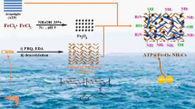 A-ATP@Fe3O4 were synthesized by co-precipitation method56. A-ATP (2.0 g) were added to 240 mL of deionized water in a 500 mL flask and stirred for 6 h. Then, the pH of the suspension was adjusted to 8 using 5 M NaOH solution. The stable suspension was bubbled with a constant N2 flow for 30 min to remove the dissolved oxygen57. Next, a 0.6 mol/L FeSO4 solution (20 m L) was added to the flask and sonicated for 30 min, followed by addition of 0.8 mol/L FeCl3 solution (20 ml). The mixture was then sonicated for 15 min. NaOH solution (5 M) was added to the flask drop wisely. Black precipitate appeared immediately after NaOH addition, and the reaction was terminated at a pH of 10. The nanocomposites were aged at 60 °C for another 1.5 h. The suspension was centrifuged at 4000 rpm for 5 min; the as-prepared Fe3O4 loaded ATP was washed with deionized water and ethanol several times to remove free ions and dried in a vacuum oven at 70 °C for 24 h. Finally, A-ATP@Fe3O4 nanoparticles with an Fe3O4-to-ATP mass ratio of 1:1 were obtained. In addition, P-ATP@Fe3O4 was prepared following the above procedure without HCl activation and Fe3O4 alone was synthesized without adding ATP. All the products were stored in a desiccator under room temperature before use.
