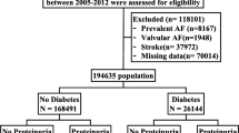 Proteinuria, particularly microalbuminuria, can be observed in the absence of any evident renal disease and earlier than any apparent decline in GFR, even in the nondiabetic and non-hypertensive population18. In such cases, urinary protein excretion reflects not only subclinical renal disease, but also generalized endothelial dysfunction19, 20. Moreover, proteinuria is more frequent in patients with diabetes mellitus, high blood pressure, and diseases that cause chronic inflammation, all of which are established risk factors for AF21,22,23. In addition, several studies recently reported that AF is closely associated with the presence of proteinuria11, 24,25,26. Therefore, proteinuria may indeed serve as a sentinel marker for AF risk.