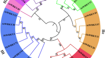 The WRKY family is one of the ten largest transcription factor (TF) families in higher plants5. The first cDNA encoding a WRKY protein to be cloned was SPF1 from Pachyrhizus erosus 6. Since then, several WRKY family member proteins have been identified from various plant species7,8,9,10,11, all of which play key roles in the response to ever-changing internal and external stimuli. The WRKY TFs are named after the WRKY domain, which consists of approximately 60 amino acids. These TFs play vital regulatory roles in developmental and physiological processes, such as seed dormancy12, embryo morphogenesis13, plant growth14, senescence15, 16, and metabolism17, 18. Furthermore, WRKY TFs are involved in responses to various abiotic and biotic stresses, such as bacteria19, 20, fungi15, 21, nematodes22, wounding23, heat, drought, salinity and cold24. Most WRKY family members contain highly conserved heptapeptides (WRKYGQK) at their N-terminals and a C2H2 or C2HC zinc-finger motif at their C-terminals7, 23, 25. However, some have altered motifs, including WRKYGEK and WRKYGKK21, 26. WRKY proteins are categorized into three distinct groups based on both the number of WRKY domains and the features of their zinc-finger-like motifs. The WRKY TFs with two WRKY domains containing C2H2 zinc-finger motifs belong to group 1. Group 2 TFs have a single WRKY domain that includes a C2H2 zinc-finger motif and are further divided into five subgroups based on their phylogenetic relationships. Group 3 TFs contain a single WRKY domain with a C2HC zinc-finger motif27.