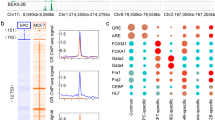 To understand how GR translates the Gc signal into genomic outputs, we identified GR binding sites (GBS) on a genome-wide scale in human podocytes using chromatin immunoprecipitation coupled with high throughput DNA sequencing (ChIP-Seq). In total, 1,130 GBS were identified following exposure to Gc and were distributed over important genomic features (Fig. 3a). Consistent with data from previous studies, the majority of GBS were located outside the intragenic and immediate proximal promoter region of genes24,25,26. 56.6% of the GBS observed in our dataset were located >2.5 kilobases (kb) away from the nearest transcriptional start site, with 41.2% of GBS located intragenically. We then investigated the relationship between the location of GBS and the Gc-responsive genes identified in the microarray dataset. Frequently, genes have been operationally defined as the coding sequence plus a fixed physical distance in each direction27. Lengths of the extensions have been from 0 to 500 kb28, 29, but most often of 20 kb30,31,32 or 50 kb33,34,35,36,37. For analysis, we separated GBS into 3 categories: i) GBS located >50 kb away from the coding sequence of any gene; ii) GBS located ≤50 kb away from a Gc-regulated gene (as defined by our microarray dataset); and iii) GBS located ≤50 kb away from a Gc-unresponsive gene (as defined by the microarray dataset). 32.4% of GBS were located >50 kb from the nearest gene (Fig. 3b). We then performed separate Cis-regulatory element annotation system (CEAS) analysis on GBS within 50 kb of a Gc-regulated gene and compared this to CEAS analysis on GBS within 50 kb of a Gc-unresponsive gene to gain insight into whether the site of GR-binding impacts gene Gc-responsiveness. This revealed that when a GBS is located within 50 kb of a Gc-responsive gene it has a higher likelihood of binding in the immediate 2.5 kb upstream promoter region. There was a greater enrichment of GBS in the 2.5 kb upstream promoter region for Gc-responsive genes compared to Gc-unresponsive genes (Fig. 3b). Although when GBS do occur within 50 kb of a Gc-responsive gene, binding within the 2.5 kb upstream region is enhanced, GBS are found within 50 kb of a Gc-responsive gene only in a minority of cases. Only 83/297 (20.9%) of Gc-regulated genes are located within 50 kb of a GBS. Motif analysis provided insight into the nucleotide sequences where GR preferentially bound. De novo motif enrichment showed that GR bound to transcriptional activator motifs (Fig. 3c). The most highly-significant de novo binding motif identified was very similar to a known progesterone receptor (PR) binding motif. This is unsurprising as PR and GR have highly homologous DNA-binding domains. A summary overview of the ChIP-Seq data is provided in Fig. 3d.
