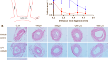 The carotid wall area was similar in NX and sham mice as measured by MRI four weeks after WI (Suppl. Fig. 1A). Based on this observation, the study was continued for two weeks. A significant difference in wall area between injured and control carotids was detected six weeks after WI (Suppl. Fig. 1B). However, there was no difference in the carotid wall area between NX and sham mice as determined by MRI and histology (Fig. 1B). This lack of effect of uremia was observed at three different anatomical locations (Fig. 1C). Also, we observed no difference in carotid medial or intimal areas between sham and NX mice (Fig. 1E,F). Based on immunohistochemistry, the content of \(\alpha \) -SMA positive SMCs in injured carotid sections of NX and sham mice was similar (Suppl. Fig. 2A, top). There were no macrophages in the lesions as judged by MOMA-2 staining (Suppl. Fig. 2B, top).