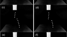 The dynamic behavior of the levitated water droplets was observed in the acoustic vortex field generated by four peripherally placed transducers arranged at R ≈ 0.9λ (see Methods). Firstly, sub-millimeter water droplets are injected just below the central trap and are caused to accelerate upwards towards the potential-well centre, as shown in Fig. 5a and Supplementary Movie 4. Initially multiple water droplets are present which quickly coalesce into a single millimeter-sized droplet which oscillates with decreasing amplitude until it stabilizes at an equilibrium position where the radiation force and gravity balance. The vertical vibration frequency f of the final droplet is ≈15 Hz. From Fig. 3b, the gradient of the force-distance curve near the array centre is near-linear. Therefore, the trapping performance can be quantified by a stiffness which can be extracted by assuming the object-trap system to be a simple mass-spring oscillator. Here, the radius of the final water droplet is about 0.7 mm, leading to a droplet mass m of 1.4 × 10−6 kg, and from, \(2{\rm{\pi }}f=\sqrt{\frac{k}{m}}\), the stiffness k can be calculated as 0.013 N/m. This compares well with the value of 0.012 N/m obtained from the simulation, i.e. the gradient of Fig. 3b at z = 0.