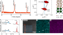 NaMnF3 thin films were grown on SrTiO3 (001) substrates by molecular beam epitaxy (MBE)17. Bulk NaMnF3 at room temperature has an orthorhombically distorted perovskite structure with lattice parameters a = 5.757 Å, b = 8.008 Å, c = 5.548 Å (Fig. 1a)22. When grown on the (001) surface of SrTiO3 (a STO = 3.905 Å), there are two configurations with best lattice matching: one with the longest orthorhombic axis (b-axis) out-of-plane and the ac-plane rotated 45° relative to the cubic cell of SrTiO3 (Fig. 1b top), and the other one with the b-axis in-plane (Fig. 1b bottom). The small lattice mismatches in both cases favor a compressive strain at the film-substrate interface.