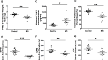 We next explored whether PCMS during adolescence has a prolonged effect on fear extinction in adulthood. One week after 28 days of PCMS or handling, the rats (n = 7–9 per group) underwent contextual fear conditioning (PND63) followed by extinction training. One day after the extinction test, the rats were given a footshock and tested for reinstatement 24 h later (Fig. 3a). The freezing scores during extinction training were analyzed using repeated-measures ANOVA, with extinction phase as the within-subjects factor and stress (control and PCMS) as the between-subjects factor. This analysis revealed significant main effects of extinction phase (F 5,70 = 43.356, p < 0.01), stress (F 1,14 = 6.580, p < 0.05) and a stress × extinction phase interaction (F 5,70 = 2.471, p < 0.05; Fig. 3b, line graph). Tukey’s post hoc test showed that freezing scores decreased in the PCMS group during phases III-V (all p < 0.05) compared with control group. In the extinction test and reinstatement test, the repeated-measures ANOVA analysis revealed significant effects of test (F 1,14 = 27.938, p < 0.01) and stress (F 1,14 = 18.033, p < 0.01) but no test × stress interaction (F 1,14 = 2.516, p = 0.135; Fig. 3b, bar graph). Tukey’s post hoc test showed that freezing scores decreased in the PCMS group in the extinction test and reinstatement test (both p < 0.05). Paired-samples t-test revealed that freezing scores in control group were significantly increased in reinstatement test compared with those in extinction test (t7 = −5.523, p < 0.01), whereas in PCMS group, freezing scores in reinstatement test were tendentially but not significantly higher than those in extinction test (t7 = −2.363, p = 0.05).