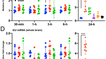 Zebrafish at 45 dpf (n = 13), 60 dpf (n = 12), 120 dpf (female, n = 8; male, n = 6) and 6 months old males (n = 10) and females (n = 10) were anaesthetised by immersing them in 0.01% benzocaine solution, followed by decapitation and fresh brain dissection. Standard lengths of the fish were not measured. Total RNA was isolated from whole brains with TRIzol reagent and converted to cDNA with a High Capacity cDNA Reverse Transcription Kit (Applied Biosystems). Levels of β-actin, bpifcl and kiss2 mRNA were examined by real-time PCR. Real-time PCR was performed in 10 μL reaction mixtures containing 1X SensiFAST SYBR Master Mix (BioLine Reagent, London, UK), 0.2 μM of each forward and reverse primer and 1 μL of cDNA. The primers used are shown in the Supplementary Table 1. Real-time PCR was performed using a 7500 Fast PCR system (Applied Biosystems) with conditions of 95 °C for 10 min, 40 cycles of 95 °C for 15 s and 60 °C for 1 min, followed by a dissociation step. The levels of each mRNA type were normalised to β-actin mRNA using the ΔΔCt method.