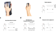To compare the sensitivity to force differences in light touch between the ASD and TD groups, a two-sample t-test was conducted on the slope (derivative). The analysis revealed there was no significant difference between the ASD and TD groups (t(40) = 1.281, p = 0.208, Cohen’s d = 0.40; Supplementary Fig. S1). To investigate the group difference in each stimulus, a mixed measures ANOVA was conducted on the percentage of strong responses using force of the stimulus (0.4 g, 0.6 g, 1.0 g, 2.0 g, 4.0 g, 6.0 g) as a within-participant factor and group (ASD versus TD) as a between-participant factor. There was a significant main effect of force of the stimulus (F(5, 200) = 670.773, p < 0.001, partial η 2 = 0.944). A post-hoc multiple comparison with Bonferroni correction revealed that all stimulus pairs except one were significantly different (all p-values < 0.001, except a pair between 4.0 g and 6.0 g, p = 0.107). There was neither a significant main effect of group (F(1, 40) = 0.347, p = 0.559, partial η 2 = 0.009), nor a significant interaction between stimulus and group (F(5, 200) = 0.881, p = 0.495, partial η 2 = 0.022; Supplementary Fig. S2).