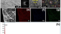 Briefly, 25 mL of graphene alcohol dispersion (2.5 mg mL−1) was mixed with 40 mL of 1 mmol Fe(NO3)3 · 9H2O and Cu(NO3)2 · 2.5H2O alcohol solution under vigorous magnetic stirring at room temperature. Then, the pH of the mixture was adjusted to 12 by 6 M NaOH and 5 mL of ethylene glycol (EG) and 5 mL of anhydrous ethylenediamine (EN) were added separately to the solution and stirred vigorously for 30 min. The solution was subsequently transferred into a 100 mL autoclave and maintained at 180 °C for 12 h. The resulting product was centrifuged, washed with deionized water and absolute alcohol several times and dried in vacuum at 60 °C for 12 h. The solid product was treated in the tube furnace at 400 °C for 2 h under a N2 atmosphere. For comparison, bare Cu/CuFeO2 was obtained by the similar procedures except for the absence of GO.