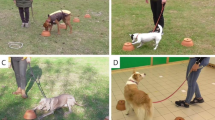 Eleven dogs completed pre-training (see supplementary information for individual dog details). They were then assigned to the experimental (n = 6) or control group (n = 5) on the basis of pre-training performance. This was to ensure that there was no significant difference between experimental and control groups in speed of learning in the final phase of pre-training (trials to criterion: experimental group (n = 6) 223 ± 135.75; control group (n = 5) 196 ± 96.59; t(9) = 0.376, p = 0.715.