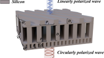 The coupled equations presented above allow \({\phi }_{{\rm{A}}}\), \({\phi }_{{\rm{B}}}\) and ε to be determined, and hence the complete set of the design parameters of the proposed half-wave plate. For simplicity, the solution searching range for \({\phi }_{{\rm{A}}}\), \({\phi }_{{\rm{B}}}\) is restricted to be within [0, π], i.e. the thickness of the dielectric slab is no more than half of the wavelength inside the dielectric medium. Because \({\phi }_{{\rm{A}}}\) is less than \({\phi }_{{\rm{B}}}\) (by definition) and the product of \(\tan \,{\phi }_{{\rm{A}}}\) and \(\tan \,{\phi }_{{\rm{B}}}\) must be negative [see Eq. (19)], we conclude that \(0 < {\phi }_{{\rm{A}}} < \pi /2\) and \(\pi /2 < {\phi }_{{\rm{B}}} < \pi \). With the help of these relations and Eq. (21), we obtain that \({\phi }_{{\rm{B}}}={\phi }_{{\rm{A}}}+\pi /2\). Plugging this result into Eq. (20), we obtain that \(({\phi }_{{\rm{B}}}-{\phi }_{{\rm{A}}})\,\sin \,2{\phi }_{{\rm{A}}}=0\). Since \({\phi }_{{\rm{B}}}-{\phi }_{{\rm{A}}}\ne 0\), we obtain that \({\phi }_{{\rm{A}}}=\pi /2\) and \({\phi }_{{\rm{B}}}=\pi \). It follows that \({d}_{{\rm{B}}}=2{d}_{{\rm{A}}}\), i.e. the metal grating must be placed at the middle plane of the dielectric slab. To determine the permittivity of the dielectric slab, we linearize φ A and φ B as \({\phi }_{{\rm{A}}}=\pi /2+{\rm{\Delta }}{\phi }_{{\rm{A}}}\) and \({\phi }_{{\rm{B}}}=\pi +{\rm{\Delta }}{\phi }_{{\rm{B}}}\) respectively. Plugging these results into Eqs (20) and (21) and requiring the first order linearized term to disappear, we obtain that \({\rm{\Delta }}{\phi }_{{\rm{B}}}=2{\rm{\Delta }}{\phi }_{{\rm{A}}}\). Plugging \({\phi }_{{\rm{A}}}=\pi /2+{\rm{\Delta }}{\phi }_{{\rm{A}}}\) and \({\phi }_{{\rm{B}}}=\pi +2{\rm{\Delta }}{\phi }_{{\rm{A}}}\) into Eq. (19) and evaluating the limiting case with \({\rm{\Delta }}{\phi }_{{\rm{A}}}\to 0\), we obtain that ε = 2, which is in agreement with the theoretical conclusion drawn previously. It should be emphasized that since here in our eigen-mode based analysis, the oblique incidence condition has been assumed at the very beginning, the deduced broadband operating conditions, i.e. \({d}_{{\rm{B}}}=2{d}_{{\rm{A}}}\) and ε = 2, should also hold for cases of oblique incidences with arbitrary incident angles. The only difference between cases of normal and oblique incidences is the shift of the central working frequencies. Note that from \({\phi }_{{\rm{B}}}=\pi \) and \(\sin \,{\theta }_{1}=\sqrt{\varepsilon }\,\sin \,{\theta }_{2}\), we find that