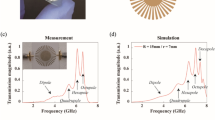 All samples are fabricated on the 0.05 mm thick Rogers 3850 (Permittivity ε = 3.0; Loss tangent Δδ = 0.0025) printed on circuit boards with one side covered by 18 μm thick textured copper disks etched based on the designs, using traditional photolithography. The simulated Cu is default conductivity of 5.88 × 107 S.m−1. Two X-band rectangle horn antennas working at 8–12 GHz are used to connect with two ports of an HP E8364C vector network analyzer to obtain the transmission spectra of normal and oblique incidence cases.