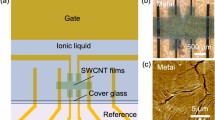 with L the inter electrode spacing (≈120 nm), W the width of the film (≈420 nm), \({C}_{\sum }\) the sheet capacitance (11.5 nF.cm−2), VDS the applied bias and \(\frac{\partial i}{\partial {V}_{GS}}\) the transconductance. We estimate the mobility in the single plane to be in the 30–50 cm2V−1s−1 range which is only one decade below the typical values obtained for molecular beam epitaxy (MBE) grown film43.
