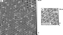 These features can be better understood by looking at the Ag adatom gas concentration map and its histogram [see the inset of Fig. 3(d)]. The Ag-2DAG concentration and the 2D work function maps have been acquired with a time delay [typ. 8 min between Fig. 3(a–d)]. This results in slightly different spatial and size distributions of the Ag 3D islands. Also the time delay makes the one-to-one correspondence between the terrace work function changes and the local Ag-2DAG concentration difficult. However both 2D maps and their respective histograms exhibit convincing similarities. In particular, dark blue terraces observed in Fig. 3(b) and characterised by \({\rm{\Delta }}\varphi \simeq -0.43\,{\rm{eV}}\) appear also as dark blue terraces in Fig. 3(c,d) with a Ag adatom concentration \(c\,\simeq \,0.08\,{\rm{ML}}\), as indicated by the black arrow. With the disappearance of the \(\sqrt{21}\)-Ag surface reconstruction, this data point (\(c\,\sim \,0.08\,{\rm{ML}}\), \({\rm{\Delta }}\varphi \sim -0.43\,{\rm{eV}}\)) is unexpectedly in agreement with the initial \({\rm{\Delta }}\phi (c)\)-linear relationship found for homogeneous surfaces [Fig. 2(b)]. When averaging over multiple atomic terraces, we derive a mean surface Ag-2DAG concentration of \(c\,\simeq \,\)0.05 ML yielding a mean work function change of \({\rm{\Delta }}\varphi \,\sim \,-0.27\,{\rm{eV}}\) which also perfectly matches the initial \({\rm{\Delta }}\phi (c)\)-linear relationship. Data obtained in the inhomogeneous regime are reported in Fig. 2 as blue symbols. This demonstrates two results: (i) the observed temporal and spatial changes of the surface work function mirror the variations of the Ag-2DAG concentration (i.e. atomic terraces highly concentrated in Ag adatoms exhibit a high charge transfer). (ii) In the inhomogeneous regime, work function changes lower than −0.4 eV can be reached owing to the disappearance of the \(\sqrt{21}\)-Ag. The initial linear work function change/Ag adatom concentration relationship obtained on homogeneous surfaces is still locally verified in the inhomogeneous regime.
