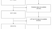 VAI, a sex-specific index based on WC, BMI, TG and HDL-C, was calculated as follows24: Males: VAI = (WC/(39.68 + (1.88 × BMI))) × (TG/1.03) × (1.31/HDL), Females: VAI = (WC/(36.58 + (1.89 × BMI))) × (TG/0.81) × (1.52/HDL). LAP was calculated as (WC (cm) − 65) × TG (mmol/L) for men, and (WC (cm) − 58) × TG (mmol/L) for women25. We used the following formula to calculate the WTI = WC(cm) × TG(mmol/L)22.