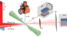 The experiment was performed with the ultrashort pulse Titanium:Sapphire-based laser system Draco, capable of continuously delivering pulses of 30 fs at a repetition rate of 1 Hz (refer to Methods section). Figure 1a gives a general overview of the experimental arrangement. At a lower laser shot rate, a single recollimating plasma mirror setup28 could be used on demand to enhance the temporal contrast (ratio between peak intensity of the main laser pulse to the amplified spontaneous emission level) to approximately 10−13 at 100 ps and steepen the rising edge at a few ps before the main laser peak (refer to Fig. 1c). The laser was focused onto the cryogenic hydrogen jet target with an estimated laser intensity of 6 × 1020 W/cm2 or 8 × 1020 W/cm2 for the laser operation with or without plasma mirror, respectively. Two different jet geometries could be produced and compared: cylindrical with a nominal diameter of 5 μm and planar of about 20 μm width and 2 μm thickness. Both jet shapes are depicted in Fig. 1b as observed along the main laser axis, with a third image showing an on-shot side view of the cylindrical jet at 3.5 ps after interaction with the drive laser. The jet position with respect to the laser focus was monitored on-shot with high accuracy by means of two picosecond probe beams that were synchronized to the main pulse and oriented close to and perpendicular to the main laser axis. Ion detectors consisted of two Thomson parabolas (TP) that were aligned along the drive laser axis and under 45°, and radio-chromic film (RCF) stacks to diagnose the proton beam profile. In case no RCF-stack was irradiated, the transmitted laser light was diagnosed by imaging a ceramic screen that was installed behind the target onto a CCD camera outside of the experimental chamber.
