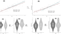 Next, we analysed the methylation scores of ELOVL2 and EDARADD in 197 saliva samples with MS-HRM (Fig. 2). Detailed information for the samples is shown in Table 2. ELOVL2 was positively correlated with the logarithm of chronological age (Pearson’s correlation coefficient r = 0.868), while EDARADD showed a negative correlation (r = −0.519). The relationship between the methylation score and the chronological age fit the logarithmic curve well for ELOVL2. The methylation score of EDARADD showed a linear decrease with chronological age. No statistically significant difference was observed between male and female samples for either of the two markers when performing analysis of co-variance (ANCOVA) (Supplementary Fig. 2; p = 0.849 and 0.382 for ELOVL2 and EDARADD, respectively). Subsequently, a final age prediction model was developed with support vector regression16 using information from both markers (Fig. 3). The MAD was 5.96 years for the training set (adjusted R2 = 0.69). Then, an additional independent set of 50 saliva samples was analysed to validate this model. The accuracy of the age prediction model was demonstrated with a MAD of 6.25 years for the test set (adjusted R2 = 0.60). However, the MAD was smaller for younger individuals than for seniors (Supplementary Table 1).