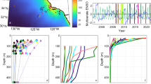 In order to evaluate the benthopelagic coupling of chlorophyll-a from the sea surface downward to the BBL (BBL-Chl), daily averaged satellite data of the U.S. MODerate resolution Imaging Spectrometer (MODIS) were analyzed. MODIS collects surface ocean chlorophyll-a data for the full range of seasonal conditions40. These satellite data are acquired at daily intervals with a 1 km spatial resolution. In order to minimize data-gaps due to cloud cover, all available daily MODIS chlorophyll data from the continental margin off Vancouver Island (British Columbia coast) described as “Regime 3”14 were used. Regime 3 encompasses the waters to the south and west of Vancouver Island and the Washington coast and includes four zones with similar seasonal variations of surface chlorophyll concentrations, with regularly occurring peaks between January and March of each year. Our data were processed in SeaDAS 7.2. (http://seadas.gsfc.nasa.gov) for subsequent analyses. Missing data due to cloud cover in the Regime 3 area were interpolated using Matlab. Calculated weekly averages of our results were compared with the MODIS, 8-day composites provided by NASA for the same period. The Aqua MODIS satellite observes water leaving radiance from the surface ocean. POC is estimated through empirical relationship derived from blue-to-green band ratios of remote sensing reflectance and in situ measurements of POC31. Estimations of POC from MODIS satellite-based observations were derived via SeaDAS from monthly correlations of chlorophyll/POC in surface waters. Daily averaged data on wave height, wind direction and magnitude were assessed from two coastal buoys (buoy 46206, La Perouse; buoy 46132, South Brooks). We used the Bakun Upwelling Index as indicator of the strength and variations in local coastal upwelling at 48°N, 125°W (southwest of Vancouver Island). We averaged hourly and daily data in order to determine possible correlations between the surface ocean attributes and BBL processes using a non-parametric Kendall’s Tau test, which accounts for temporal autocorrelation and is frequently used for non-normal data distributions typical for hydrological data41. Time-series analyses of both time and frequency domains were carried out to evaluate the impact of tidal- and storm induced sedimentation of phytoplankton and previously documented types of oscillatory flow in the northeast Pacific42.