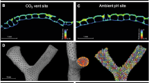 Carbonate chemistry (Supplementary Table S1) and pH within conditioning aquaria was controlled via the addition of concentrated (5%) CO2 gas mixed with ambient air using multi-channel gas proportioners (Cole-Palmer©). Temperature and pHT measurements were made daily using a DuraFET III (Honeywell) ion-sensitive field-effect transistor-based (ISFET) solid-state pH sensor. Bi-weekly, samples were obtained for dissolved inorganic carbon (DIC) analysis using an EGM-4 Environmental Gas Analyzer® (PP systems) after acidification and separation of gas phases using a Liqui-cel® Membrane (Membrana). Saturation states for both aragonite (Ωaragonite) and calcite (Ωcalcite) in addition to pCO2 were calculated from levels of total DIC, pH, pressure, temperature, salinity, phosphate, silicate, and first and second disassociation constants for estuarine waters as determined by Millero et al. (ref. 73) using CO2SYS (http://cdiac.ornl.gov/ftp/co2sys/). Certified reference material (provided by Andrew Dickson, Scripps Institution of Oceanography) was analyzed before and after analysis of experimental samples as a quality assurance measure and provided 104 ± 5% recovery.