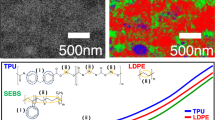According to our results, as the local heating and weakening of the polymer substrate is a primary cause of the current-induced deterioration of electromechanical performance, we can expect to improve the electromechanical performance of the polymer-supported metal film system under an electrical current by enhancing the deformation resistance of the polymer substrate at elevated temperatures. Two methods can be followed for achieving this purpose. One is to increase the thickness of the polymer substrate and the other is to utilize a polymer substrate with a high glass transition temperature. To demonstrate these methods, we varied the substrate thickness and material: 400 nm Ag/38 μm PET, 400 nm Ag/25 μm PI, and 400 nm Ag/125 μm PI samples were additionally fabricated and tested. Figure 6 compares the test results. Regarding substrate thickness, as shown in Fig. 6a, the electromechanical behavior of the 400 nm Ag/PET or 400 nm Ag/PI samples was almost identical irrespective of the substrate thickness when the electrical current was not applied. With the application of an electrical current, though, the deterioration of electromechanical performance (i.e., the increase of electrical resistance) with strain was accelerated for both the thin PET and PI substrates. The onset strain at which the curve of I = 0.3 A started to deviate from that of I = 0 A was ε = 2.9% for 400 nm Ag/38 μm PET; ε = 6.5% for 400 nm Ag/188 μm PET; ε = 8.0% for 400 nm Ag/25 μm PI; and ε = 9.5% for 400 nm Ag/125 μm PI. The stretchability (or stretchability loss) data, shown in Fig. 6b, also confirmed that the current-induced deterioration became more severe with a thinner substrate; the thick PET or PI substrates always possessed a higher stretchability (or a lower stretchability loss) than the thin versions in the electrical power range of I 2/t o = 25 A2 mm−1 (J = 2.5 × 104 A cm−2) to I 2/t o = 625 A2 mm−1 (J = 1.25 × 105 A cm−2). The underlying mechanism of the improved current-induced deterioration with increasing substrate thickness can be understood by considering that the higher heat capacity of the thick substrate mitigates the temperature rise of sample during the tensile test. This leads to a high deformation resistance, which consequently suppresses the necking instability in the thick substrate. It is noted that the effect of substrate thickness on the current-induced deterioration was noticeable with the Ag film/PET substrate samples, while it was minor in the Ag film/PI substrate samples. As for the effect of substrate material, the Ag films on the PI substrates with a high T g of ~400 °C41 showed excellent electromechanical characteristics under electrical currents, compared to the Ag films on the PET substrates with a low T g of ~70 °C41 (Fig. 6). Note that there was no marked difference in the electromechanical characteristics between the Ag films on PET and PI substrates without the application of an electrical current: the stretchability was ~25% for both 400 nm Ag/38 μm PET and 400 nm Ag/188 μm PET; 26% for 400 nm Ag/25 μm PI; and 27% for 400 nm Ag/125 μm PI. As explained earlier, the onset strain for the 400 nm Ag/25 μm PI system at which the I = 0.3 A and I = 0 A curves started to deviate was 8.0%, even higher than that of 400 nm Ag/188 μm PET (6.5%). The curves of 400 nm Ag/25 μm PI and 400 nm Ag/125 μm PI with I = 0.3 A did not significantly deviate from the curves of I = 0 A (Fig. 6a). Such an improved electromechanical performance with the Ag film/PI substrate system was reflected in the stretchability (or stretchability loss) data. As shown in Fig. 6b, the stretchability of the Ag film/PET substrate samples steeply reduced with increasing electrical power, but for the Ag film/PI substrate samples, the reduction of stretchability with electrical power was remarkably inhibited. The stretchability loss of the 400 nm Ag/38 μm PET was 3% at I 2/t o = 25 A2 mm−1 (J = 2.5 × 104 A cm−2) and increased to 81% at I 2/t o = 625 A2 mm−1 (J = 1.25 × 105 A cm−2), while that of 400 nm Ag/25 μm PI was 0.6% at I 2/t o = 25 A2 mm−1 and 34% at I 2/t o = 625 A2 mm−1. These results clearly demonstrate that the two suggested methods are effective for reducing the current-induced deterioration of electromechanical performance in the polymer-supported metal films. It is noteworthy that utilizing a polymer substrate with a high glass transition temperature is a more effective means of enhancing the deformation resistance at elevated temperatures, and increasing the thickness of polymer substrate can be thought of as a means of assistance. In addition, these findings again confirm that the mechanism of the current-induced deterioration suggested in the present study is reasonable.