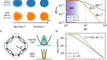 We use the same formalism as given in ref.15, which is now adapted for the mixed dimensions. For the lattice dimension, we use a one-band nearest-neighbor tight-bind lattice model, and thus the dispersions for the two components are \({\xi }_{{\bf{k}}\uparrow }={{\bf{k}}}_{\perp }^{2}/2m+2t\mathrm{[1}-\,\cos ({k}_{z}d)]-{\mu }_{\uparrow }\) and \({\xi }_{{\bf{k}}\downarrow }={{\bf{k}}}^{2}/2m-{\mu }_{\downarrow }\). Here \({{\bf{k}}}_{\perp }\equiv ({k}_{x},{k}_{y})\), where \({\mu }_{\sigma }\) (with \(\sigma =\uparrow ,\downarrow \)) are the fermionic chemical potentials. The one-band assumption is appropriate when the lattice band gap is large compared to Fermi energy E F , which may be realized experimentally via a large confining trapping frequency \({\omega }_{z}\gg {E}_{F}\). Indeed, similar one-band models have been used throughout condensed matter theory studies, e.g., in various high T c superconductivity theories and negative-U Hubbard models17. (In particular, the typical condensation energy per particle is much less than E F , even at unitarity, and thus not enough to compensate the energy cost for a lattice fermion to occupy the excited bands). As usual, we consider an s-wave short range pairing interaction. The bare fermion Green’s functions are given by \({G}_{0\sigma }^{-1}(K)=i{\omega }_{n}-{\xi }_{{\bf{k}}\sigma }\). We refer the readers to ref.15 for convention on the four-vector notations and Matsubara frequencies.
