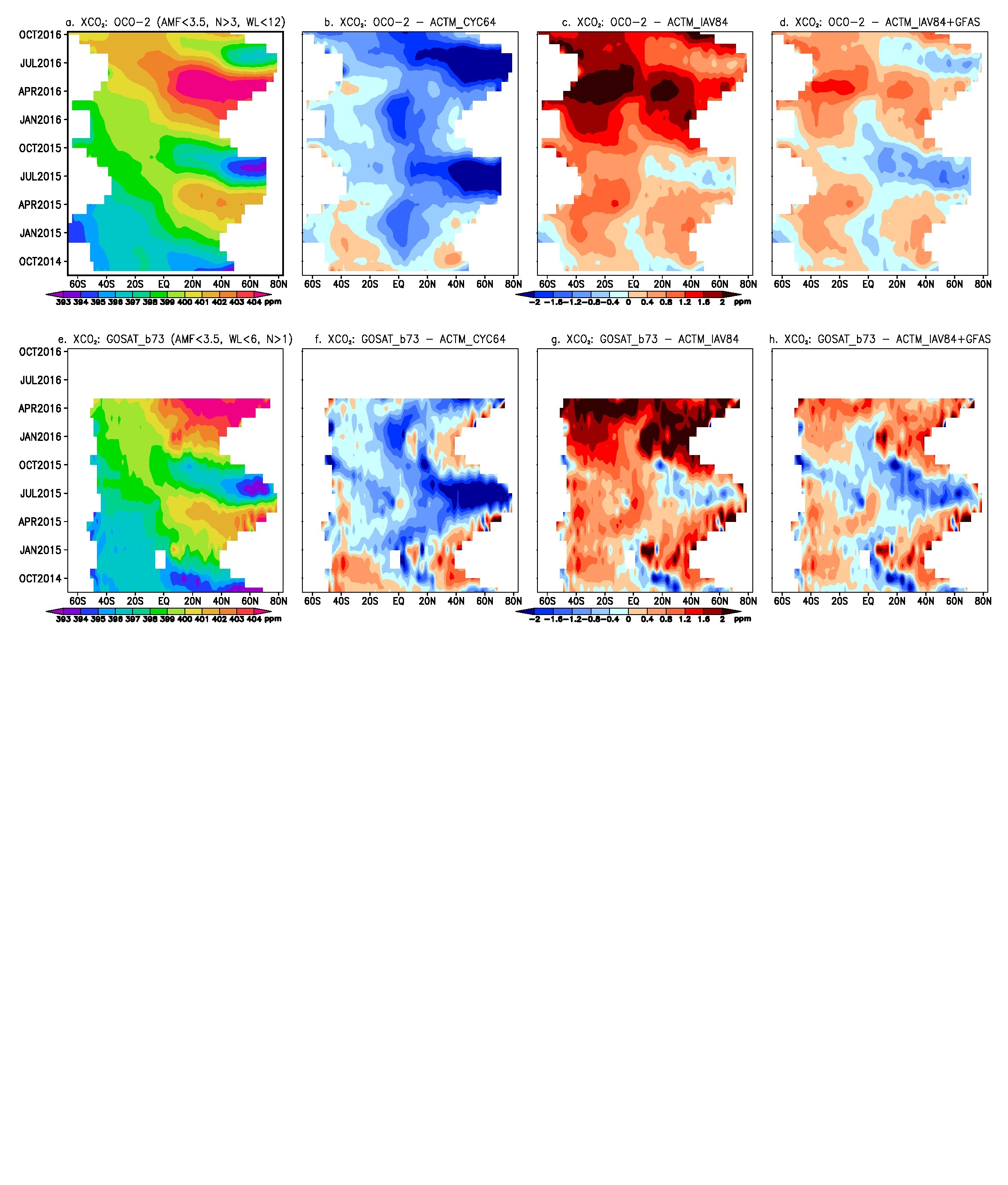 Time evolution of XCO2 from satellites and model. Latitude-time distribution of XCO2 (in ppm) measured from OCO-2 (a) and GOSAT (e), and their differences with 3 cases of ACTM simulations (b–d and f–h, respectively) for the period of OCO-2 operation, from 07 September 2014 to 31 October 2016 (GOSAT ACOS b7.3 are available until 31 May 2016). Note the striking similarities between OCO-2 and GOSAT measurements and ACTM_IAV84 + GFAS simulation case, particularly over the tropics. Further detailed comparisons of GOSAT and ACTM, with separation for soundings over land and water surfaces suggests the positive model biases in the high latitude regions arise mainly over the ocean surface. Similar plots cannot be made using data from the TCCON or NOAA network sites without significant interpolation in space and time due to the geographically sparse sampling of the ground-based networks.