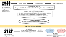 A total of 207 participants, including 104 AAAD+ patients (of which 74 with hypertension and 30 without hypertension), and 103 age-matched AAAD− individuals (of which 59 with hypertension and 44 without hypertension) were enrolled in this study. Table 1 shows the demographics and clinical features of different cohorts of people. As shown in Fig. 1, we designed a multiphase study to identify serum miRNAs as surrogate markers for predicting the prognosis of AAAD, especially for those individuals with hypertension. In the initial biomarker selection stage, serum samples were collected from Nanjing Drum Tower Hospital, Jiangsu, China. 25 AAAD+ cases, 30 matched AAAD− controls were subjected to ABI TaqMan Low Density array (TLDA) and RT-qPCR analysis. The significantly altered miRNAs were selected and validated in additional 64 AAAD+ cases and 58 AAAD− controls. Next, the predictive value of identified miRNA profile was evaluated in another cohort by blinded trail. Finally, the refined panel of serum miRNAs was tested in the prediagnosis serum samples to determine whether this biomarker set might be useful for early AAAD detection. There was no significant difference in the distribution of age between different groups of cohorts, while the AAAD+ group had more hyperlipidemia patients and alcoholic abusers than the AAAD− control groups. Neither the AAAD+ group nor AAAD− had any history of atherosclerosis, bicuspid aortic valve and cocaine abuse. All 3 patients with a history of aortic aneurysm and 5 Marfan’s syndrome patients were in normal blood pressure AAAD+ cohort (Table 1). In general, AAAD+ patients and AAAD− control subjects had no other significant cardiac dysfunction, active infection (hepatitis, tuberculosis, etc.), and neurological or psychiatric disorders at the time when blood was drawn.