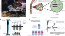 Shallow water hydrothermal sediments were collected at Spathi Bay, 36°40′N; 24°31′E (Fig. 1a–g), southeast of Milos Island, at 12.5 m below sea level. As stated above and shown in Fig. 1b, the site is characterised by the emission of mainly CO2 and characteristic zones of white- and brown-capped seafloor deposits surrounding the vent area5,46. The sampled site had a white-capped sediment-seawater interface extending 8 m long by 3–5 m wide, rimmed by a brown-capped deposit (Fig. 1a–g). Local spots of hydrothermal emission are characterized by gas bubbles located within the white-capped deposits (Fig. S3). Large areas of sandy sediments, not visibly affected by direct hydrothermal activity (i.e., lacking gas emission and surface-capped coloured precipitates) extend from the rim of the brown-capped deposits outward. Sampling was therefore performed along a transect extending from the sandy outskirt through the brown- to white-capped deposit, to capture the metabolic potential of these three distinct seafloor habitats. The unconsolidated sediments were collected by SCUBA diving using polycarbonates push core tubes and capped underwater with rubber stoppers. Duplicate cores, from each habitat, were collected for geomicrobiological survey (geomicrobiology cores 1 and 2) and for the chemistry (chemistry cores 1 and 2), with polycarbonate tubes containing pre-drilled holes for the extraction of porewater, using rhizones, for geochemical and isotopic analysis. Cores for geomicrobiological analyses were subsampled under a N2 gas atmosphere in the field using an anaerobic glove bag (Glove Bag Inflatable Glove Chamber, Cole-Parmer). The sediment cores were sliced every 2 cm. Push core 1 collected in the brown-capped deposit was sliced every 4 cm using a disposable sterile plastic spatula and then stored on dry ice. Each section was divided into two: one for genetic survey and the other for corresponding geochemistry. These samples were stored in 50 ml Falcon tubes on dry ice, until subsequent storage at −80 °C in the laboratory. Porewater was extracted from the chemistry replicate cores using rhizones connected to depressurized exetainer® bottles. Exetainers for DIC concentration and isotopic analysis were stored upside down at 4 °C until analysis. After porewater collection, one push core per habitat was transferred into the glove bag and sliced aseptically every 2 cm for further bulk δ13C isotopic analysis. Samples were placed in 50 ml Falcon tubes and stored under N2 in an anoxic bag, frozen and shipped on dried ice. At the laboratory, they were frozen at −20 °C.