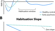 The objective of our study was to test for habituation effects in (a) behavioral data and (b) neuroimaging data, which we assessed for each patient using the regression approach first introduced to fMRI data by Plichta et al.17 and also recently applied to behavioral analysis40. This approach is based on the regression \(Y=bX+a\). The regression coefficient b is an estimate of the rate of habituation and has been shown to be dependent on the intercept of the regression line a 17,27. Therefore, the absolute habituation index b’ is a measure independent of the initial amplitude of the response. It has been determined according to Plichta et al.17 and Montagu27 using the formula \(b\text{'}=b-c(a-\bar{a})\), in which c is the slope of b on a and ā is the mean of a 17,27. A negative value of b’ indicates habituation.