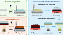 Fluorine doped tin oxide glass substrates (FTO, Pilkington, TEC 15) were patterned by etching with Zn powder and 4 M HCl diluted in deionized water. The etched FTO substrates were subsequently cleaned by ultrasonication in a detergent solution, deionized water, acetone and isopropanol respectively, then rinsed with deionized water, ethanol and dried with clean dry air29,30,31,32. A dense blocking layer of TiO2 was deposited onto the substrate by spin-coating a TiO2 colloid solution at 3000 rpm for 30 seconds and then annealed at 450 °C for 1 hour. For the mesoporous TiO2 film, TiO2 paste (Dyesol, 18 NRT) was used in absolute ethanol in the ratio 1: 3.5 by weight, which was spin coated on the FTO/c-TiO2 substrates at 5000 rpm. for 30 seconds, followed by drying at 130 °C for 10 minutes sintering at 500 °C in air for 15 minutes. Two-step solution chemistry method was used to fabricate the underlayer CH3NH3PbI3 inside a glove box (Mikrouna, Universal). In briefly, PbI2 were dissolved in DMF (500 mg/mL) at 70 °C and spin-coated on the FTO/TiO2 substrates at 5000 rpm for 5 seconds then dried at 70 °C for 30 minutes. Upon cooling, CH3NH3I was dissolved in iso-propanol solution (10 mg/mL) at 70 °C dropped on FTO/TiO2/ PbI2 substrates for 120 seconds and spin-coated at 5000 rpm for 30 seconds. They were dried by spin-coating at 3000 rpm for 20 seconds and by heating at 70 °C for 30 minutes. For the VSHM samples, they were transferred into the evaporator which was inside the above glove box for PbCl2 and CH3NH3I evaporation. The thickness of the PbCl2 and CH3NH3I films were adjusted by the temperature and time of the evaporation. Full details of the evaporation are provided in the supporting information. Then, they were dried by heating at 70 °C for 30 minutes. The FTO/TiO2/Perovskite substrates were deposited by spin-coating a HTM layer solution at 3000 rpm for 30 seconds, where a spiro-OMeTAD (BoRun)/chlorobenzene (73.2 mg mL−1) solution was employed with addition of 17.5 µL Libis (trifluoromethanesulfonyl) imide (Li-TFSI, aladdin)/acetonitrile (520 mg mL−1) and 28.8 µL tert-butylpyridine (TBP, Sigma). Finally, the counter electrode was deposited by thermal evaporation of silver under a pressure of 8 × 10−5 Torr. The active area of the cell was measured to be 0.1 cm2 which was masked by a black tape during the testing of the cells.