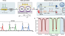 Since temporal degree of freedom is not coupled with the spatial degree, we expect the case of time-bin entanglement is much simple and first distribute it over the 1-km-long FMF. The time-bin entangled photon pair source shown in Fig. 2(a) is based on pulse pumped SFWM process in a 300-m-long dispersion-shifted fiber (DSF), which is similar to the source reported in ref.4 In SFWM process, two photons of the strong pump are annihilated via \({\chi }_{xxxx}^{\mathrm{(3)}}\) nonlinearity to simultaneously create quantum mechanically correlated signal and idler photon pairs. In our source, the central wavelength and bandwidth of the pump pulses are 1555.61 nm and 1.2 nm, respectively. By using a free space unbalanced Mach-Zehnder interferometer (MZI), the pump pulses are decomposed into two temporally separated components, P 1 and P 2. The components P 1 and P 2 define two time slots and the time delay between the two slots is ~ 1.5 ns. P 1 generates correlated photon pairs \(\mathrm{|1}{\rangle }_{s}|1{\rangle }_{i}\) in the first time slot, while P 2 generates photon pairs \(\mathrm{|2}{\rangle }_{s}\mathrm{|2}{\rangle }_{i}\) in the second time slot. Here the subscript s(i) denotes the signal (idler) photon. Since P 1 and P 2 are coherent, a time-bin entangled state \(|{\rm{\Psi }}\rangle =\frac{1}{\sqrt{2}}{\mathrm{(|1}\rangle }_{s}\mathrm{|1}{\rangle }_{i}-{e}^{i2\phi }\mathrm{|2}{\rangle }_{s}\mathrm{|2}{\rangle }_{i})\) is produced, where \(\phi \) refers to the relative phase difference between P 1 and P 2. The output entangled signal and idler photons are filtered by using 200-GHz-spacing wavelength-division multiplexing (WDM) filters with central wavelengths at 1560.61 nm and 1550.92 nm, respectively.