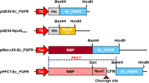 For construction of hFGF21-expression vectors, the Gateway cloning system based on BP and LR recombination reactions was used17. A DNA codon-optimised sequence encoding 181 amino acid residues of mature hFGF21 (GenBank: AAQ89444.1) was synthesised (GenScript, Piscataway, NJ). The tobacco etch virus protease recognition site (TEVrs), ENLYFQ/G, was placed at the N terminus of the hFGF21 polynucleotide. The synthesised DNA sequence was then subcloned into pDONR207 via a BP reaction to obtain an entry clone named pENTR-hFGF21. Following the BP reaction, expression vectors were created by means of LR reactions between the pENTR-hFGF21 vector and one of eight destination vectors: pDEST-HGWA, pDEST-SUMO, pDEST-HXGWA, pDEST-HGGWA, pDEST-HMGWA, pDEST-HNGWA, pDEST-PDI, or pDEST-PDIb′a′. The correct clones of all the expression constructs were confirmed by sequencing (Macrogen, Deajeon, Korea).