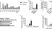 From each animal, tissues from all 4 cranial lobes and a bronchial lymph node were collected into 1.5 ml tubes containing 500 μl MEM medium (Life Technologies), and weighed before homogenising with a BulletBlender (Next Advanced Inc. Averill Park, NY, USA). The homogenates were centrifuged and the supernatants transferred into new tubes and stored at −70 °C. RNA was extracted using the QIAmp viral RNA extraction kit (Qiagen AG, Hombrechtikon, Switzerland) according to the manufacturer’s instructions. The IAV genomic RNA segment 7 was amplified by reverse transcription and quantitative polymerase chain reaction (RT-qPCR) using primers and probe as described42,43. The RT-qPCR was performed as published using the SuperScript III Platinum One-Step RT-qPCR Kit (Life Technologies) and run on a 7900HT Thermocycler (Applied Biosystems) for 50 cycles. Mean Cq values were determined from triplicates. For absolute RNA quantification, an internal standard was used based on M1 genome copies42,43.