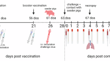 The animal experiments were performed according to local law and were approved by the Ethical Committee for Animal Experiments of the Canton of Bern, Switzerland (license #BE7/12). In total, 31 healthy seven-week-old Swiss Large White pigs (18 castrated males and 13 females) from our specific-pathogen-free (SPF) breeding facility were used. The animals were housed in groups of ≥3 inside the containment facility of the Institute of Virology and Immunology IVI representing a BSL3-Ag facility. Prior to infection, the animals were allowed to accustom to the new environment for one week.