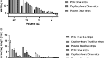 The microarrays were specifically designed for 1-microliter tear sample analysis. The standardization of the miniaturized immunoassays had included several important steps. We selected the high-affinity compatible antibody pairs (using SPR and sandwich ELISA assays) and chose appropriate slide surfaces for the linkage of capture antibodies. We experimentally determined the incubation times and washing and blocking buffers. We also performed cross-reactivity studies to assure specificity of the assays and adjusted the calibration curves to clinically relevant concentration ranges (unpublished data).
