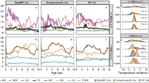 As stated above, soil MBT′5ME is well correlated with measured MAT, particularly in the sunny slope of Mt. Fanjing. To examine the applicability of the soil MBT′5ME for reconstructions, the calibration function proposed by De Jonge37 is used to derive the MBT′5ME-based MAT for samples collected from the study area, and produced ΔMAT with subtracting the measured MAT and the 9-month MAT by the MBT′5ME-based MAT. The results show that the MBT′5ME-based MATs are consistently higher than the measured MATs (Fig. 3C), but they are much closer to the 9-month MATs (Fig. 3D). In more details, the calibrated MBT′5ME-MATs are about 1~7 °C higher than the measured MATs. On the other hand, the calibrated MBT′5ME-MATs are only in small variations with the 9-month MATs. It is likely that the measured annual air temperature is the annual average value, rather than the average temperature above the threshold for biological activity of the brGDGT-producing organisms. As previously reported, brGDGT-producing bacteria are more active during spring, summer and autumn than during the rest of the year23,38, thus the calibrated MBT′5ME-MATs may be more consistent with warmer seasonal temperatures32,38. Moreover, as 5.5 °C is the lowest optimal base for experimentally determining the lifecycle of the plant or insect39, e.g. Growing Day Degrees >5.5 °C (GDD 5.5; the cumulative daily mean temperature above 5.5 °C) may be a better indicator of the bacterial activities. Temperature data from Mt. Fanjing meteorological station confirms that most of the temperatures lower than 5.5 °C is recorded in the months of January, February and December. In other words, the 9-month MATs (exclude Jan., Feb. and Dec.) are more appropriate for comparison (Fig. 3D). Since the RMSE of the global MBT′5ME-MAT calibration function is 4.8 °C37, the ± 4 °C temperature differences (Fig. 3D) fall within the error range. This analysis, therefore, confirm that the MBT′5ME is applicable for reconstructing Mt. Fanjing 9-month MAT, and it agrees with the findings that brGDGTs production is seasonally biased32,38. What’s more, the uncertainty of the global soil calibration (RMSE = ± 4.8 °C) is also one of the reasons attributed to the temperature differences between MBT′5ME derived and measured MAT values.