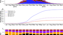 The entomophthoralean fungus Massospora cicadina Peck infects periodical cicadas (Magicicada spp.) during their regionally synchronized, roughly month-long adult emergences every 13 or 17 years12,13 and is the only known predator or pathogen synchronized to the cicadas’ life cycles14,15. Mycosis follows a predictable phenology. Early in a periodical cicada emergence, “Stage I” infected cicadas produce haploid conidiospores capable of infecting other actively chorusing adult cicadas16,17,18. Later in the emergence, “Stage II” cicadas infected by conidiospores produce diploid resting spores that fall to the soil and complete the fungal life cycle by infecting the next generation of cicada nymphs due to emerge 13 or 17 years later18,19. Stage I Massospora infections are acquired as nymphs emerge from the soil19, while Stage II infections are spread among adult cicadas of the same generation.