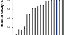 Gliptins and diprotin A were purchased from NAMIKI SHOJI Co., Ltd. (Tokyo, Japan) and Peptide Institute, Inc. (Osaka, Japan), respectively. Half-maximal inhibitory concentration (IC50) values were determined by fitting to a sigmoid curve (4-parameter logistic curve) using ImageJ73. Competitive inhibition rates were measured using different concentrations of each inhibitor in a reaction buffer containing 50 mM sodium phosphate buffer pH 8.0, 5 mM EDTA and 0.005% Tween 20 at 298 K for 20 min and using 100 µM Gly-Pro-MCA as the substrate. Inhibitor concentrations for PmDAP IV were 0.78, 1.56, 3.13, 6.25, 12.5, 25, 50 and 100 µM, and those for human DPP IV were 0.78, 1.56, 3.13, 6.25, 12.5, 25, 50 and 100 nM. Standard deviations were calculated from three independent experiments. Fluorescence intensity was measured with excitation at 355 nm and emission at 460 nm using an Infinite 200 PRO microplate reader. Inhibition constants (Ki) were calculated using the Cheng-Prusoff equation74. Gliptin sensitivities and diprotin A sensitivities of the wild-type and mutant PmDAP IVs and human DPP IV are summarised in Tables 4 and 5, respectively.