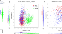 In order to ensure that our method of normalization or our use of closed-reference OTUs did not unduly bias our results, we performed and additional analysis (Supplementary Figures S1–S3), using QIIME open-reference picking and rarefication to 10,000 sequences. In our QIIME open-reference picking pipeline, OTUs were picked with the method uclust at a similarity threshold of 0.97. OTUs with cluster less than 5 sequences were discarded. As a result, 18,162 OTUs were clustered with 15,719 of these classified at phylum level and 6,378 classified at genus and 2.16% of the reads remaining unclassified. The OTU table was then rarefied to 10,000 reads per sample. Samples with less than 10,000 reads were discarded and OTUs absent in more than 75% of the samples were discarded. OTU counts and taxonomic assignments using rarefied samples counts were then log-10 normalized with a pseudo-count of 1.