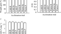 Saravanan et al.13 showed that both hypoxia (DO 4.0 mg O2 l−1) and an amino-acid-imbalance diet produced a significant reduction in FI in rainbow trout. However, the study showed that oxygen consumption in trout were unaffected by the dietary imbalance. Similarly, the oxygen consumption in Nile tilapia were not altered by dietary lipid to carbohydrate ratios, while FI was affected14. Both studies suggest that nutritional factors affecting energy use and oxygen availability could pose constraints on FI, although fish may have effective mechanisms to compensate for changes in energy intake in order to achieve energy balance.