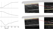 During the MVCs the VL fascicles were captured by B-mode ultrasonography (My Lab60, Esaote, Genova, Italy). A 10 cm linear array probe operating at 43 Hz (LA923, 10 MHz, depth 7.4 cm, focal point 1.8, no image filter) was attached to the skin above the VL muscle belly (≈50% of femur length), adjusted with respect to parallel superficial and deeper aponeurosis and clarity of aligned hyperechoic perimysial intramuscular connective tissue that is indicative for the muscle fascicle structures, and fixed by elastic straps. The ultrasound device and motion capture system were synchronised by a manually-released 5 V trigger signal. The fascicle length was determined from the ultrasound videos by a self-developed semi-automatic tracking algorithm29 written in Matlab (version R2012a, The Mathworks, Natick, USA). Briefly, the procedure included an approximation of the deeper and superficial aponeurosis by a best linear fit through three manually placed and frame-by-frame adjusted marks on the respective inner connective tissue layer (Fig. 1). Then, a semi-automated algorithm based on the bwtraceboundary function of the Matlab Image Processing toolbox automatically identified the shape and orientation of image brightness features between both aponeurosis in each frame, which are indicative for the hyperechoic perimysial connective tissue parts (snippets) aligned with the muscle fascicles (Fig. 1). Detected snippets were considered as valid the following requirements were fulfilled: minimal length of 23 pixels (i.e. 0.4 cm, from the bottom left to the top right point of a snippet); area to length ratio of 8.5 (identifies white areas with a long and narrow shape that were then converted to lines); angle between snippet and upper aponeurosis between 6° and 35°; 80% of the pixels on a line between the start and end point of a snippet had to be white. Every frame was visually controlled afterwards for adequate feature placement and manually corrected if necessary (e.g. non-perimysial connective tissue portions were removed). A linear reference fascicle was calculated as an average of the single identified features and was used for fascicle length determination (Fig. 1). Furthermore, the fascicle length was averaged over ten frames from the plateau of each MVC. On the basis of the maximum force applied to the patellar tendon and the corresponding VL fascicle length, an individual force-fascicle length relationship was calculated for each participant based on a second-order polynomial fit (Fig. 2), to determine the maximum muscle force applied to the tendon (F max ) and the L o for force generation. VL muscle specific constants of a rel = 0.34 and b rel = 4.03 s−1 22 were used to assess the maximal fascicle shortening velocity V max = 11.85 L 0 s−1. The force-velocity relationship of the VL fascicles was then described following the classical Hill equation2.