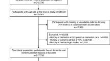 Participants were screened for dementia at baseline and subsequent centre visits21. Those with a Mini-Mental State Examination score < 26 or Geriatric Mental Schedule score > 0 underwent further investigation and informant interview, including the Cambridge Examination for Mental Disorders of the Elderly. In addition, the entire cohort was under continuous surveillance for dementia through electronic linkage of the study database with medical records from general practitioners and the regional institute for outpatient mental health care. A consensus panel led by a consultant neurologist established the final diagnosis according to standard criteria for dementia (DSM-III-R) and Alzheimer’s disease (NINCDS–ADRDA). Within this period, participants were censored at date of dementia diagnosis, death, loss to follow-up, or 1st January 2015, whichever came first.