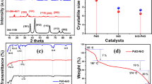 UV-visible spectra of the solution in UV cuvette containing 3 mL of 0.01 mM MO and 0.5 mL of 0.1 M NaBH4 in the presence of 25 mg of prepared catalysts were monitored and recorded after every minute. Figure SI-1a–d and SI-2a–e exhibited the UV-vis spectra of MO reduction by NaBH4 as a function of time in the presence of different MNPs templated on CS-TiO2-15 and Cu-NPs loaded on different wt% of TiO2 in CS-TiO2 nanocomposite, respectively. The regular decrease in intensity at λmax = 464 nm and increase and shift of absorption band from 270 nm towards 250 nm with time can be observed in all spectra. These results suggest that the -N = N- site of MO was reduced by NaBH4 in the presence of catalyst and produces amino compounds of low molecular weight. Therefore, the appearance of the new peak at 250 nm (Fig. 6a), during the MO reduction was considered as the formation of -NH2 compounds79. The ln (A t /A0) and percent reduction of MO as a function of time were calculated from the UV-visible spectra by using the following equations: