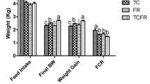 Institutional Animal Ethics Committee of DIHAR approved the field experiment and all the methods were performed as per the guidelines of animal experimentation. The experiment was carried out under deep litter system in the solar poultry house of DIHAR having a stacking density of 0.80 square feet per bird in 2 × 2 feet of pen size (5 birds/pen). The ambient temperature of the house was maintained at 25–32 °C by using local bukhari (a heating device). A total of 105 one day old RIR cross-bred broiler chickens were randomly distributed to seven experimental groups as per completely randomized design. There were 3 replications per treatment with 5 chickens per replicate pen. Chickens in the control group were fed the basal diet whereas chickens in the six treatment groups were supplemented with aqueous extract of H. rhamnoides fruit in drinking water @ 100 mg/kg body weight of chicken (T1), @ 150 mg/kg body weight of chicken (T2), @ 200 mg/kg body weight of chicken (T3), @ 300 mg/kg body weight of chicken (T4), @ 400 mg/kg body weight of chicken (T5), and @ 800 mg/kg body weight of chicken (T6), respectively, in addition of basal diet. Experiment was conducted from 0 to 42 days of broiler chick age. A standard in house feed formula specific for high altitude poultry chickens developed by our laboratory was used to formulate the basal diet2. All the birds were given the same basal diet, included a starter diet (21.56% protein, 12.97 MJ/Kg ME, 1.02% calcium, and 0.48% phosphorus) from day 1 to day 21 and a finisher diet (19.31% protein, 13.38 MJ/Kg ME, 0.94% calcium, and 0.42% phosphorus) from day 22 to d 42. The ingredients and analysed composition of basal diet are presented in Table 1. On 7th day, all the chickens were vaccinated for Newcastle disease. Every chicken was individually weighed at each week interval. Throughout the experiment, water and feed intake was measured. During the experimental trial autopsy inspection of dead birds was done to find out the cause of death. Economics of the experiment was also estimated based on the rearing cost of chickens.