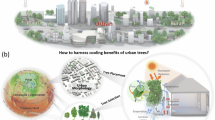 We found that the wind speed is strongly positively correlated with the cooling effect of Tree-covered UGV in the MC zone, while negatively correlated with the Grass-covered UGV (Tables 4,5). In the TMC zone, the wind speed is also positively associated with the cooling effect of Tree-covered UGV, while the correlation is weaker than that of the MC zone. This result may contribute to the evapotranspiration and heat convection of UGVs. Dimoudi and Nikolopoulou38 and Gunawardena et al.13 revealed that the evapotranspiration rate and convective heat transfer coefficient were higher with higher wind speed conditions when the air temperature exceeded 25 °C. The increase in wind speed would result in a decrease in leaf temperature and help to transfer the cooling effect to the surrounding area. However, when the temperature exceeds a certain point, the effect of evapotranspiration decreases. In MC cities, the significant temperature difference between the Tree-covered UGV and surrounding environment can be easily recognized (Supplementary Tables 9,10). For Tree-covered UGV in MC cities, the wind speed would contribute to transfer cooler air (convective heat transfer) to their surrounding environment. The reason for the negative correlation of Grass-covered UGV would be the evapotranspiration decreasing under the condition of high temperature. The relatively weak correlation in TMC cities might be explained by the presence of intensely compact urban structures with many high-rise buildings. Therefore, the aerodynamics and microscale wind condition in these cities are more complex than in MC cities.