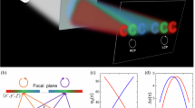 The images produced by the metasurface lens under different circular polarizations are shown in Fig. 3a. For linearly polarized light an equally bright image would appear on both detectors since it contains an equal proportion of LCP and RCP. The smallest bars in group 5 have a spacing and width of 8.77 which is larger than the diffraction limit of the chiral meta-lens: \(d={\lambda }_{0}\mathrm{/2}NA\) = 5 μm. Due to the smaller size of the bars on the resolution test chart, the intensity contrast is lower. The spatial resolution along the x-axis is more sensitive to chromatic aberrations than the spatial resolution along the y-axis due to the grating term ±2x f sinθ in the phase profile. This effect can be seen in the different sharpness between the horizontal and vertical bars in the image, because of the bandwidth of the super-continuum laser (10 nm).
